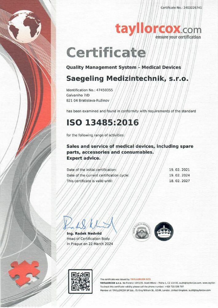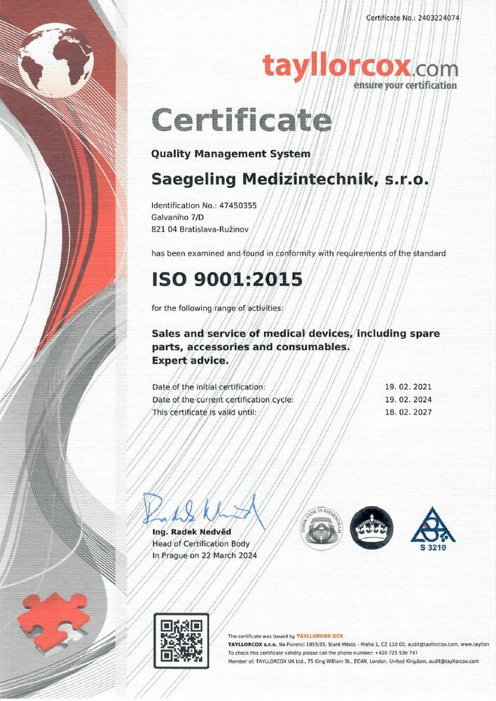 V roku 2016 získala spoločnosť certifikáciu podľa DIN EN ISO 9001 a DIN EN 13485 pre systém riadenie kvality ako i pre oblasť riadenia kvality – zdravotnícke pomôcky. Odvtedy je úspešne recertifikovaná.